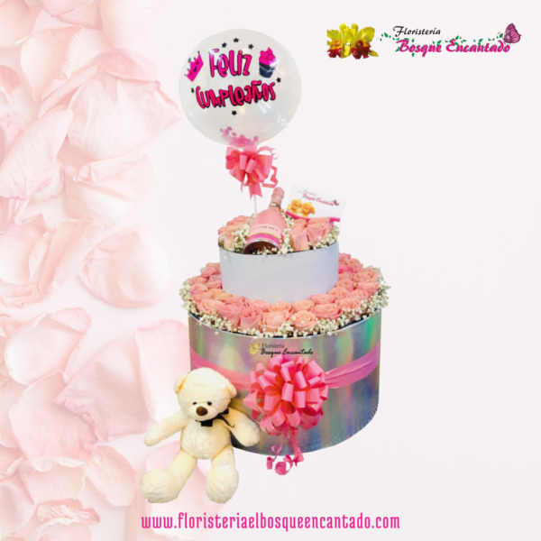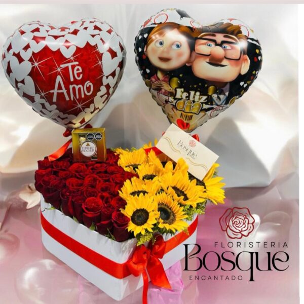 Ramo tradicional en rosas base larga blanca + Rosas en distintos colores + peluche pequeño + Globos en helio en