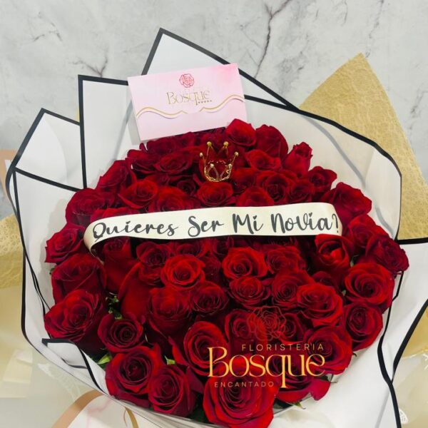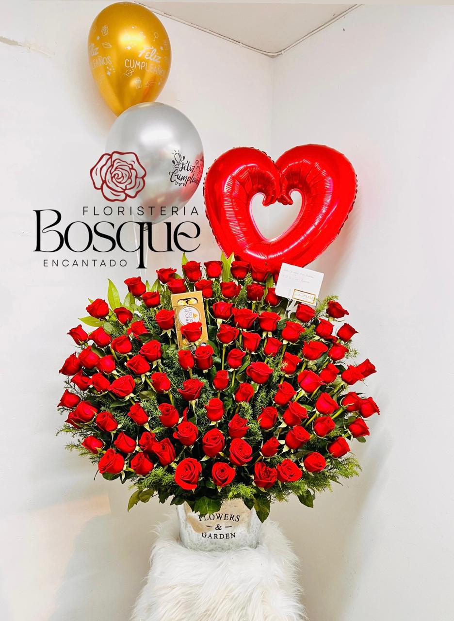 Arreglo rectangular en rosas + globo metalizado estampado según la ocasión