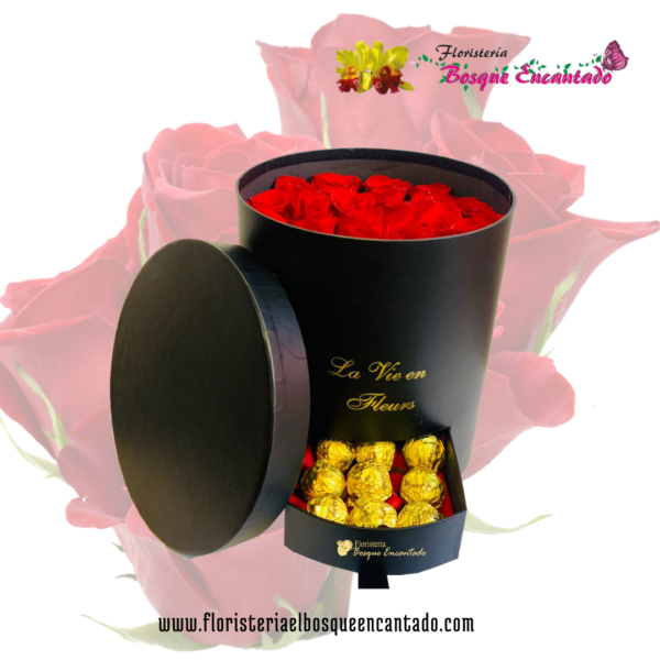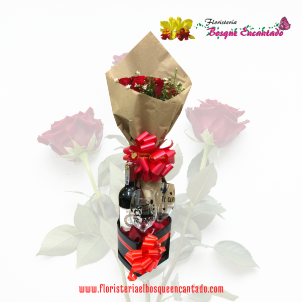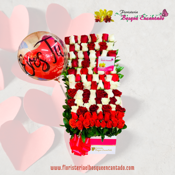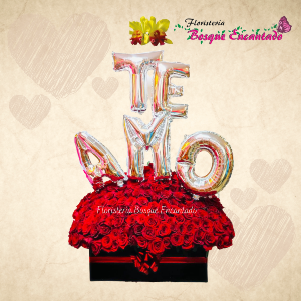Arreglo rectangular en rosas + letrero en globo metalizado te amo