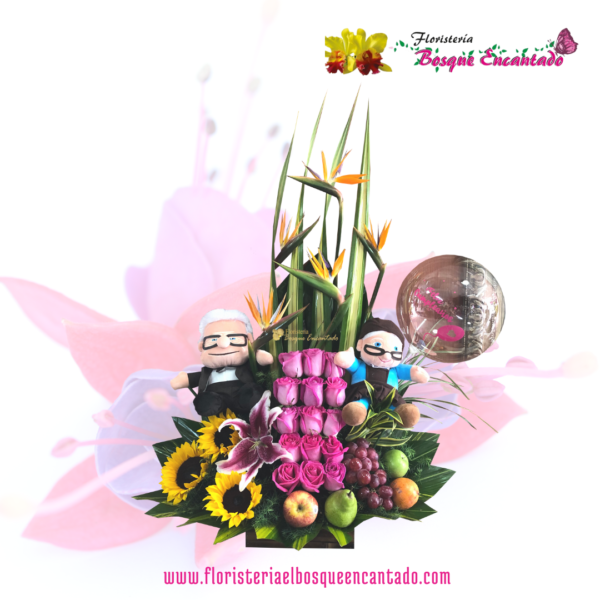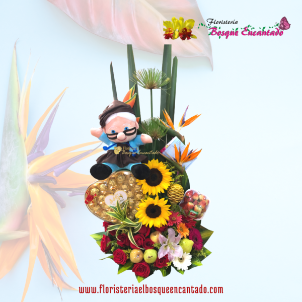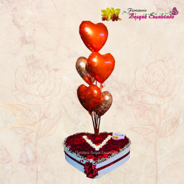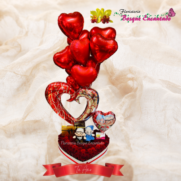 Corazón mediano en rosas + peluches pequeños + chocolates + globo metalizado grande + globos en helio