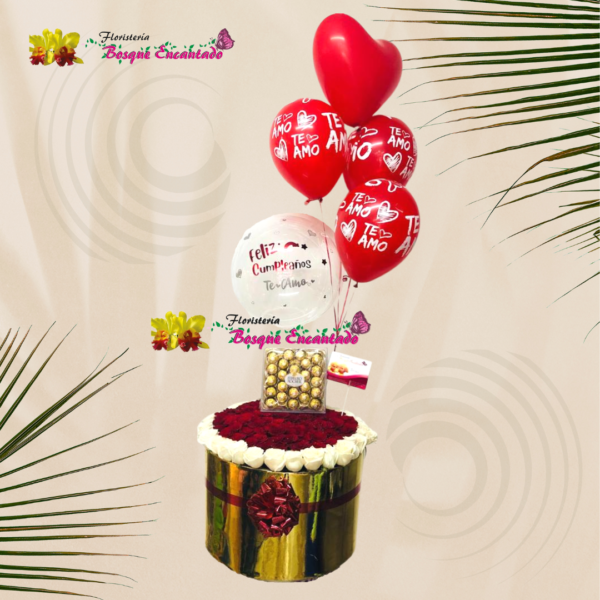 Arreglo redondo en rosas + chocolates + globos en helio + globo personalizado