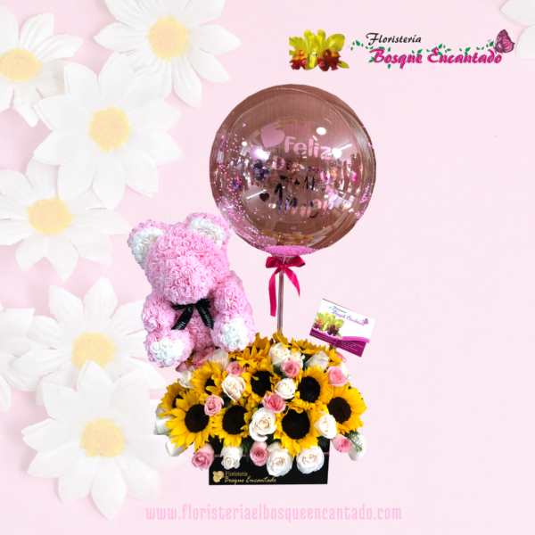 Arreglo Cuadrado en girasoles + oso en foami + globo personalizado