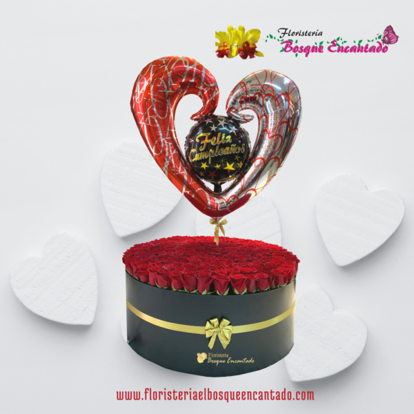 Caja redonda gigante en rosas + globo grande corazon + globo metalizado estampado según la ocasión
