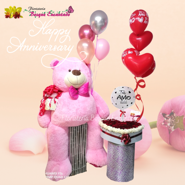 Corazón mediano en rosas + peluches pequeños + chocolates + globo metalizado grande + globos en helio