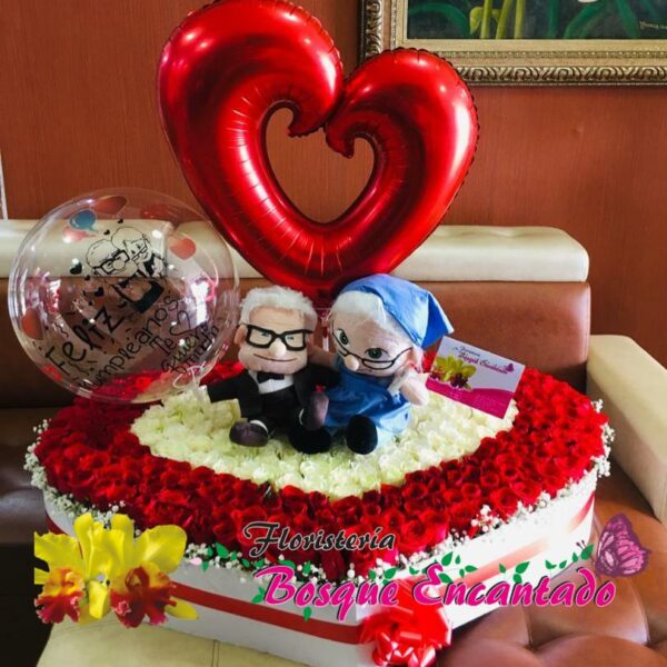 corazón gigante, en rosas rojas, centro rosas blancas y globos