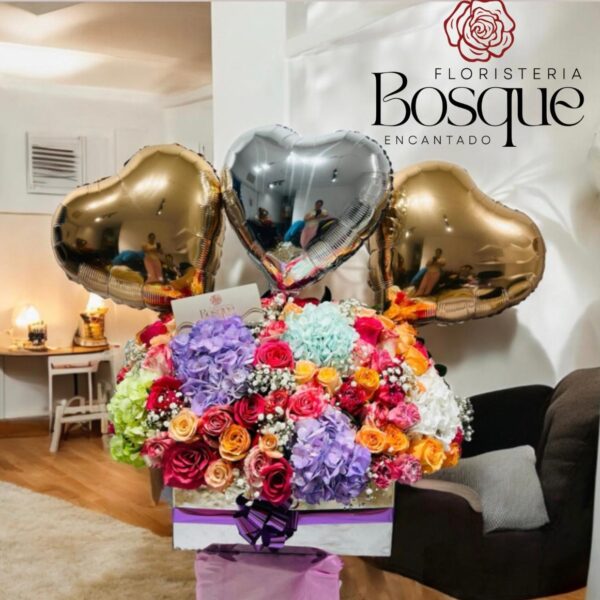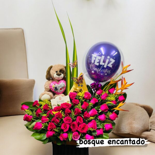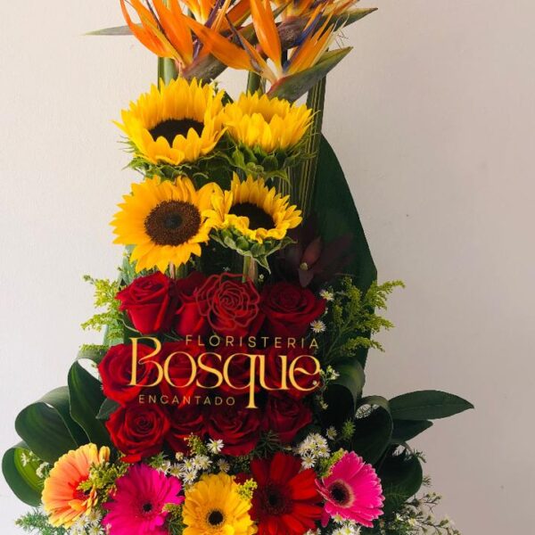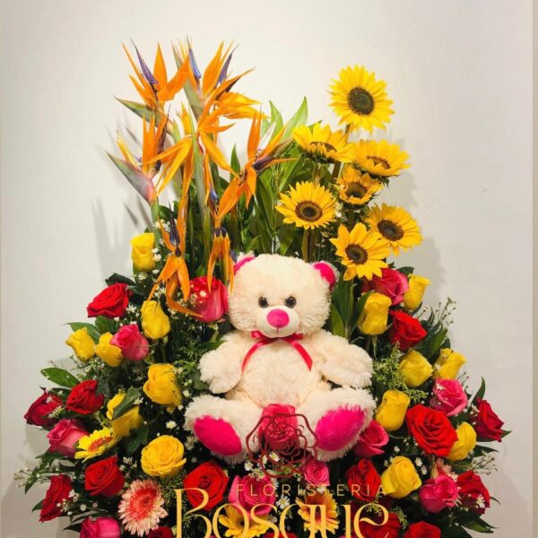 Tradicional con rosas de colores, girasoles, aves de paraíso y peluche