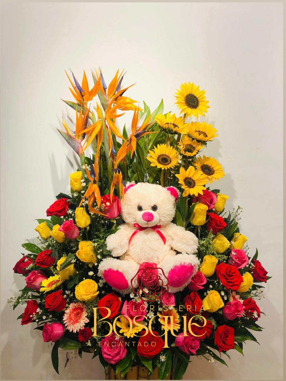 Tradicional con rosas de colores, girasoles, aves de paraíso y peluche